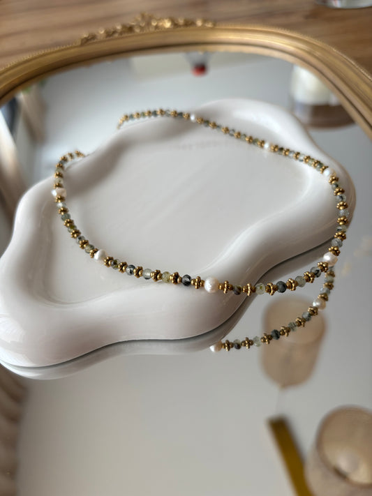 SHELLY - Collier en Pierre Naturelle Agate Mousse, en perles d’eau douce et en Acier Inoxydable