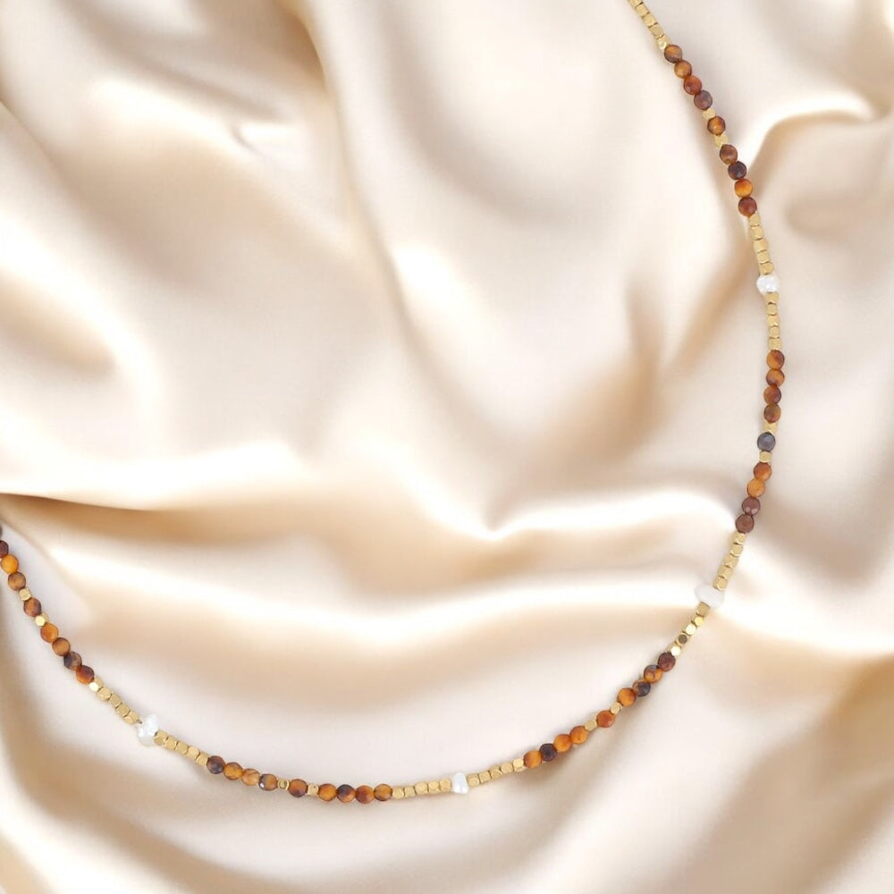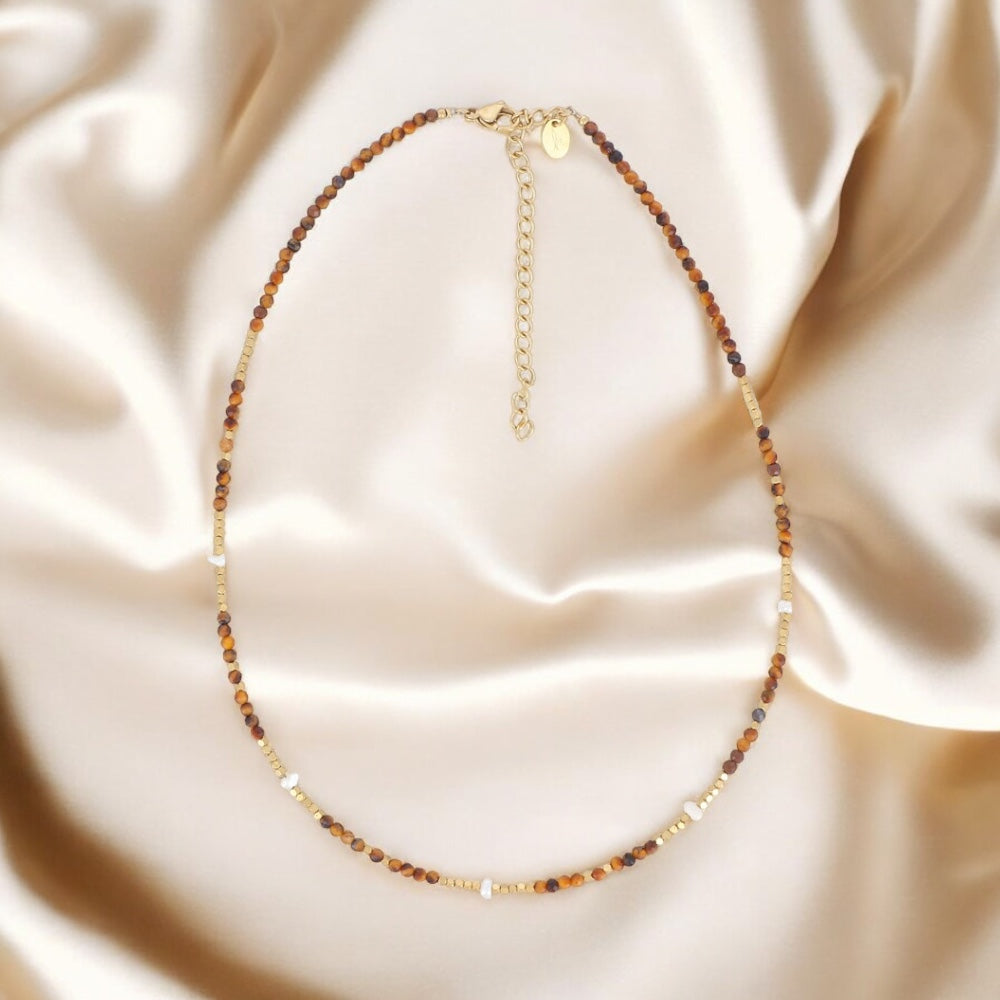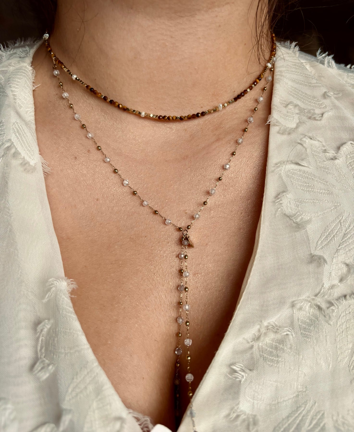 Le collier ARIANNA allie l’éclat intemporel de l’acier inoxydable doré à la beauté unique des pierres naturelles.