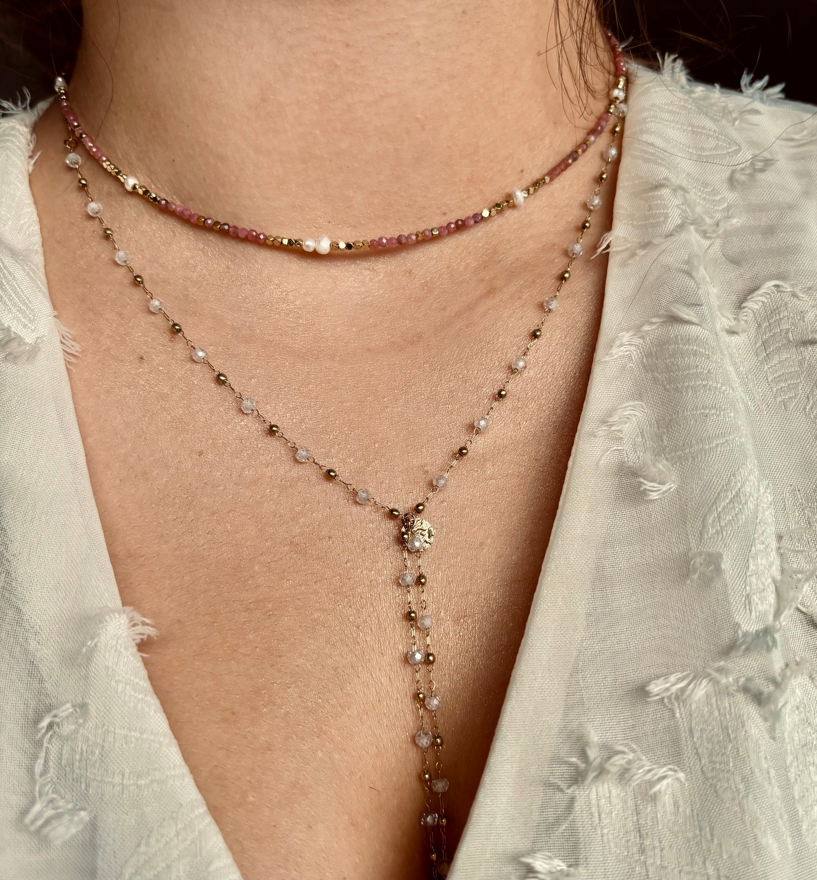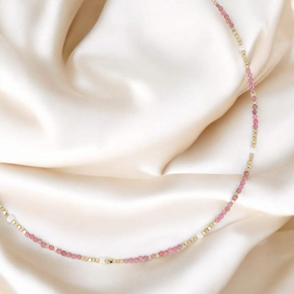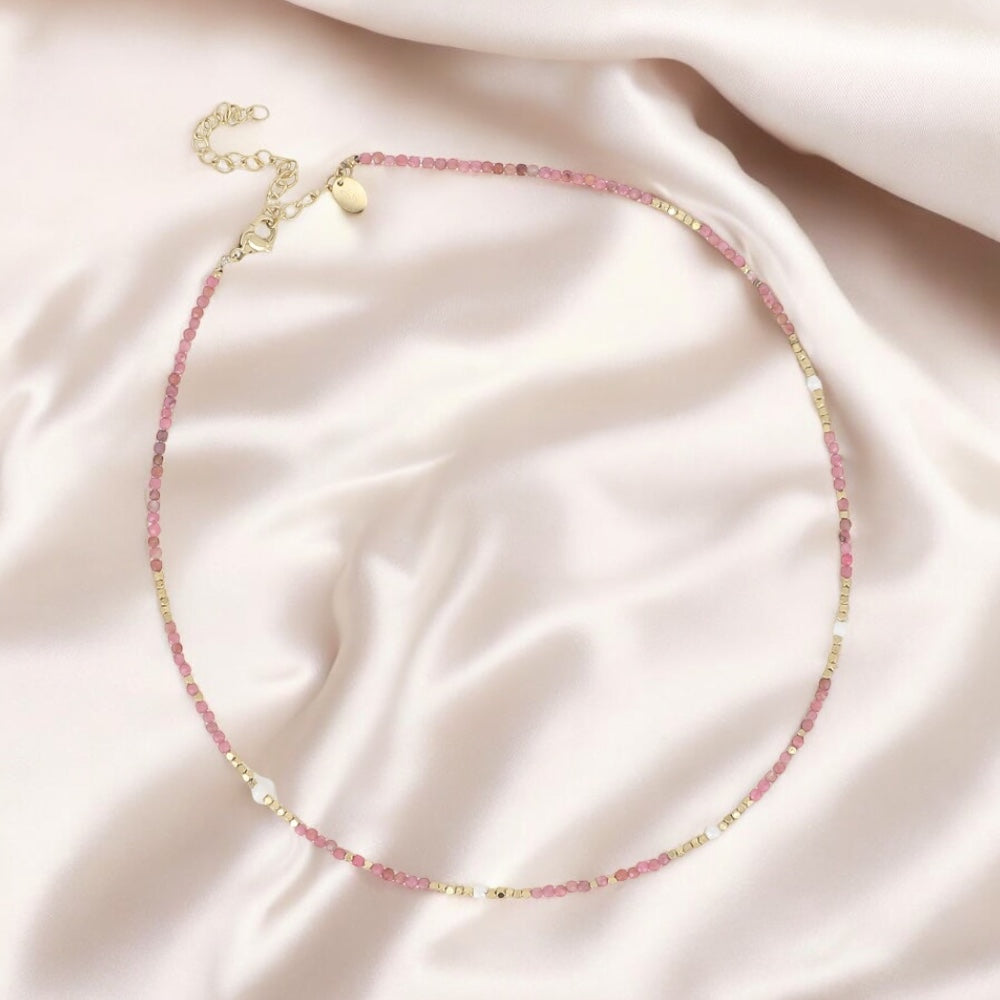 Le collier FRAISY , composé de pierre naturelle quartz fraise , de perles d'eau douce et d' acier inoxydable doré , représente une véritable alliance entre élégance intemporelle et robustesse . Sa finition dorée étincelante capte la lumière à chaque mouvement, ajoutant une touche de raffinement à votre allure et une brillance subtile qui met en valeur chaque détail.